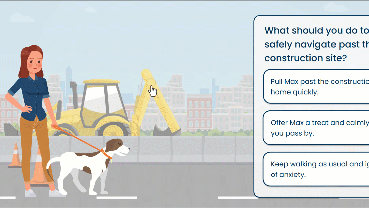 After testing the prototype, I moved into full development in Storyline 360, refining timing, visuals, and interactions based on feedback. I used variables to dynamically update the learner's selected avatar and dog throughout the experience and built in visual feedback for every decision.